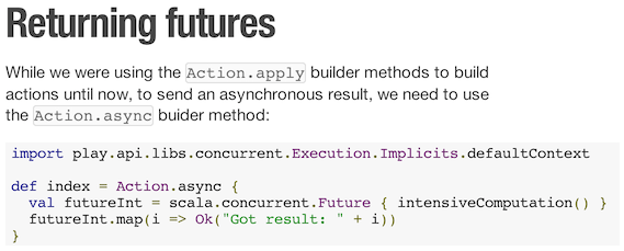 This documentation is generated from markdown files using the play-doc project. For example, here is the Markdown for the “Returning futures” section: